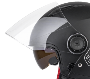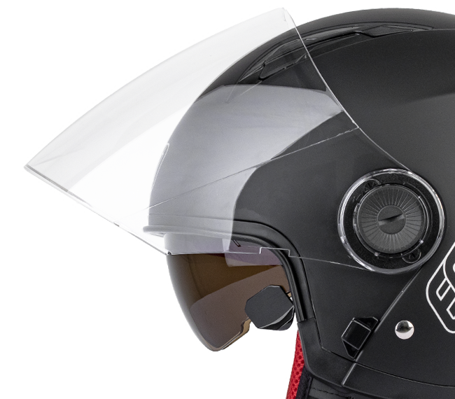 Mũ được trang bị một kính chắn gió che chắn toàn bộ khuôn mặt, có thể nâng cấp kính phụ màu tối âm bên trong mũ, vừa có tác dụng giúp chắn mưa, bụi côn trùng, vừa che nắng, chống chói mắt khi di chuyển trong thời tiết nắng gắt. Người đội có thể an tâm di chuyển dưới nhiều điều kiện thời tiết khác nhau.